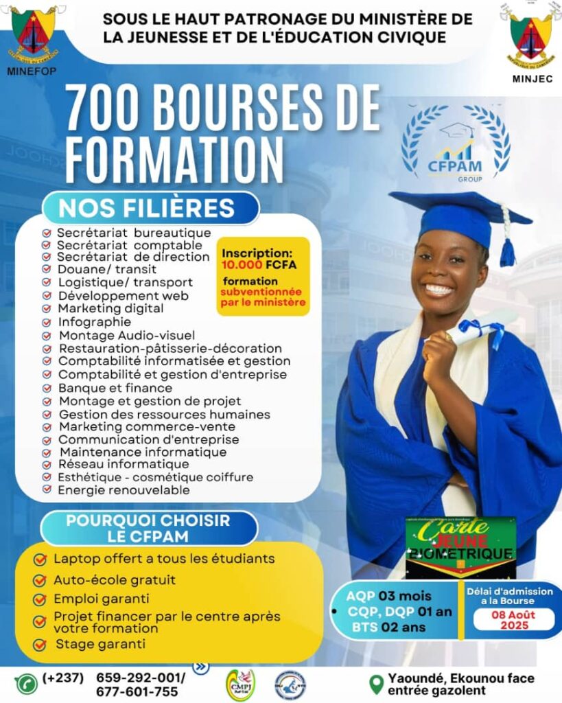 Cette opportunité unique de se former dans des domaines d’avenir ne doit pas être négligée. Les jeunes camerounais sont encouragés à saisir cette chance pour transformer leur potentiel en compétences reconnues. Dans un monde du travail de plus en plus exigeant, se former correctement est un atout précieux, et cette bourse représente une porte d’entrée vers un avenir prometteur.