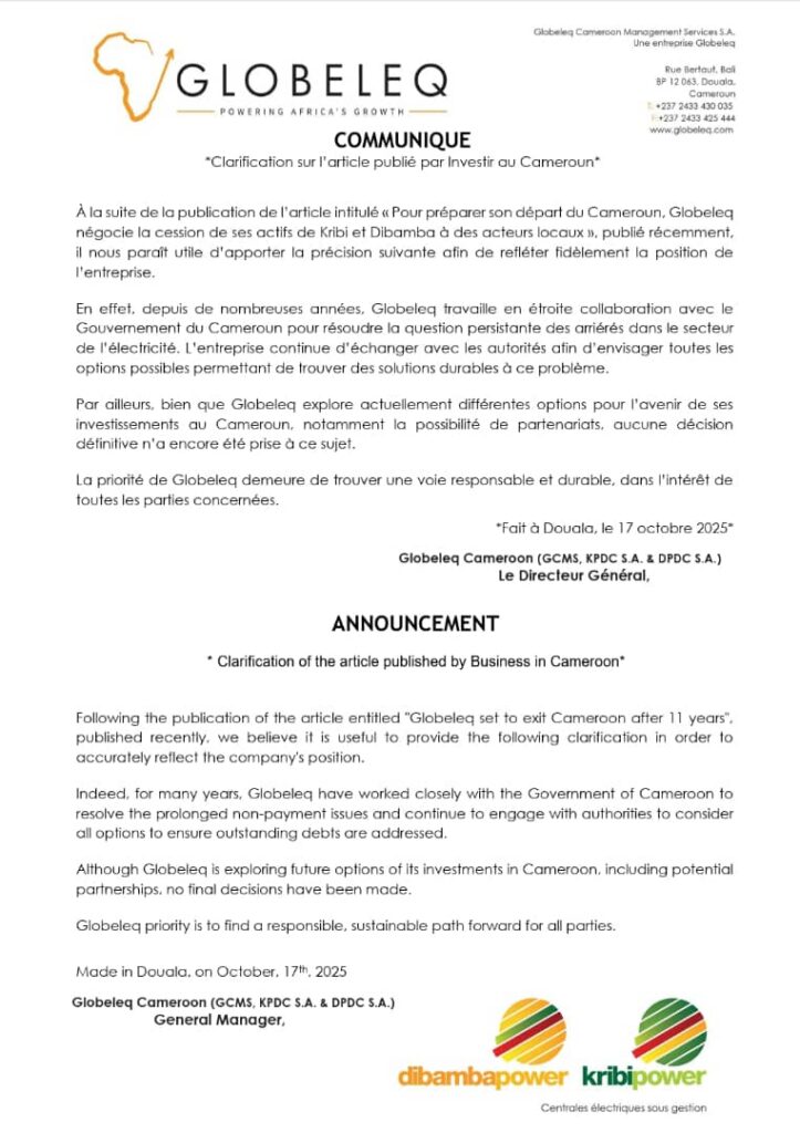 (LVDE) – Dans un communiqué rendu public le 17 octobre 2025, Globeleq indique explorer actuellement différentes options pour l’avenir de ses investissements au Cameroun, notamment la possibilité de partenariats, qu’aucune décision définitive n’a encore été prise à ce sujet. (Voir communiqué).