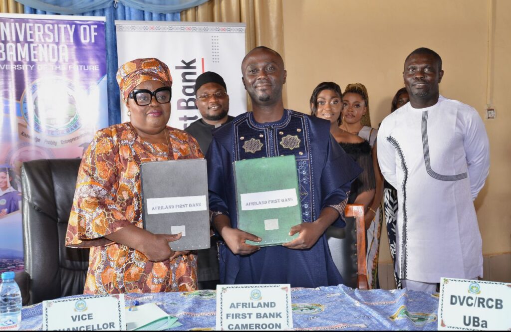 La cérémonie de signature a eu lieu en présence de la Pr. Theresa Nkuo-Akenji, Vice-Chancelier de l’Université de Bamenda, et de M. Ngoran Sefola Harret, Directeur Réseau Ouest d’Afriland First Bank. Pr. Nkuo-Akenji a souligné la pertinence de ce partenariat, notant qu’il est en parfaite adéquation avec les orientations du ministère de l’Enseignement supérieur. Elle a déclaré : « Cette collaboration s’inscrit dans une dynamique de professionnalisation des formations et de renforcement des savoir-faire des étudiants. Elle constitue une passerelle essentielle entre le monde académique et le monde professionnel, facilitant ainsi l’insertion socio-économique des jeunes diplômés et contribuant à la compétitivité nationale. »