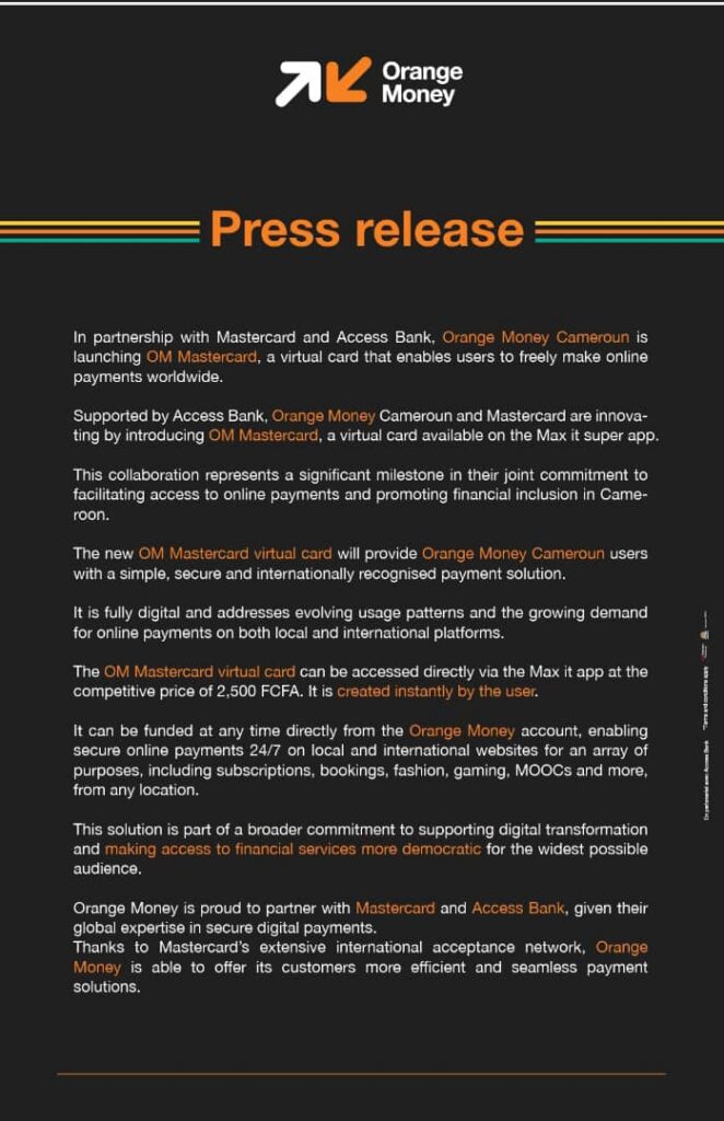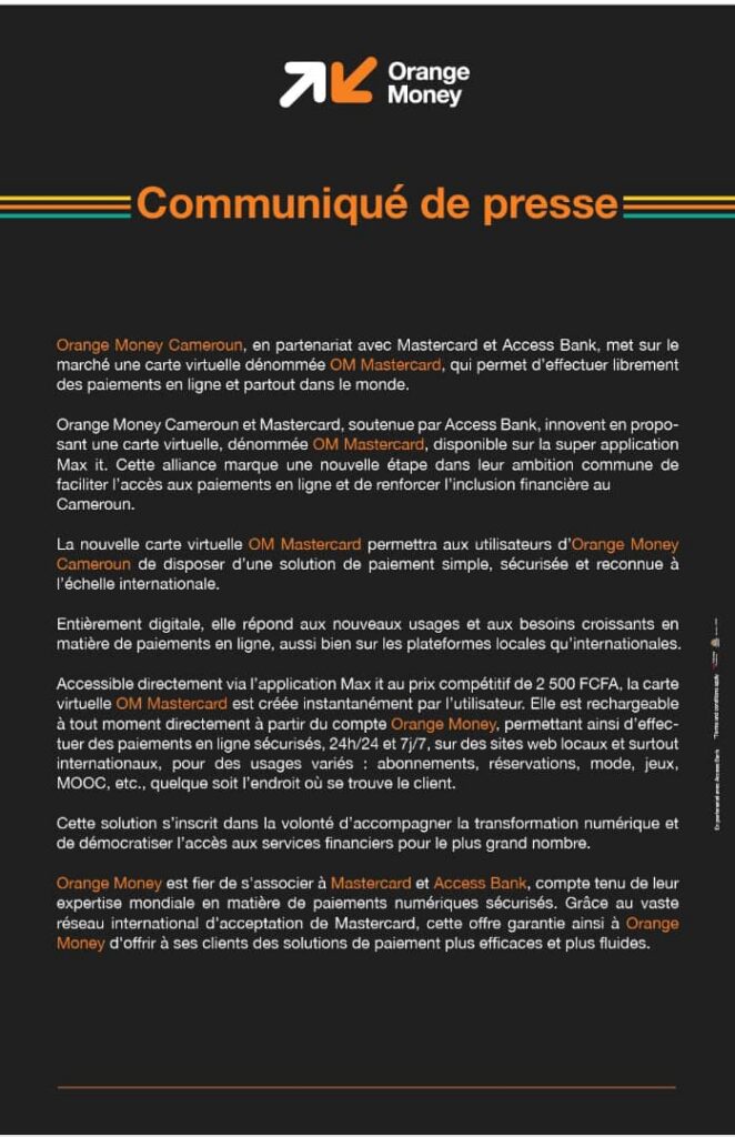 (LVDE) — With the launch of the OM Mastercard, Orange Money Cameroon, in partnership with Mastercard and Access Bank, is opening up new opportunities for Cameroonian users, enabling them to make simple, fast and secure online payments anywhere in the world.