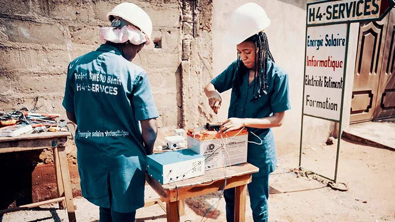 Angélique et Odette, originaires du Bénin, ont quitté l’école en cinquième et quatrième année lorsque leurs familles n’ont plus pu payer les frais de scolarité. Aujourd’hui, leur parcours est très différent. Grâce au SWEDD, les deux jeunes femmes ont pu se former à une activité économique non traditionnelle : l’électrification de bâtiments et l’installation de panneaux solaires photovoltaïques. Elles ont désormais un meilleur emploi et travaillent depuis plus de deux ans avec une entreprise privée qui installe des panneaux solaires. La fierté dans leurs voix est indubitable. « Maintenant, nous sommes motivées et nous gagnons de l’argent pour subvenir aux besoins de nos familles », explique Angélique. « Nous sommes heureuses d’apporter l’énergie solaire aux villages. »